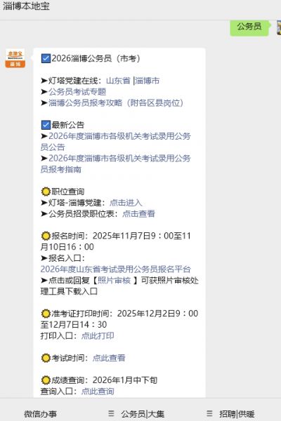 微信搜索公众号【淄博本地宝】,关注后在对话框回复【公务员】可获2026山东省考试录用公务员报名平台及灯塔党建在线官网入口/省考、市考最新公告/报考时间表/报考指南/职位表在线查看/准考证打印/成绩查询入口(持续更新)